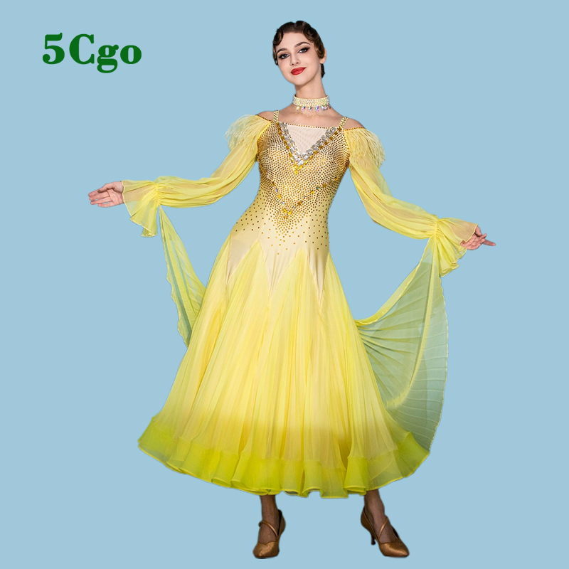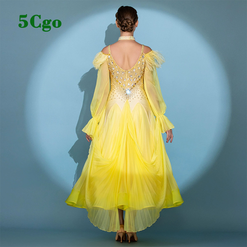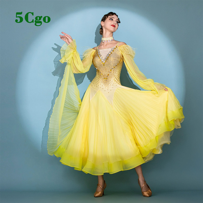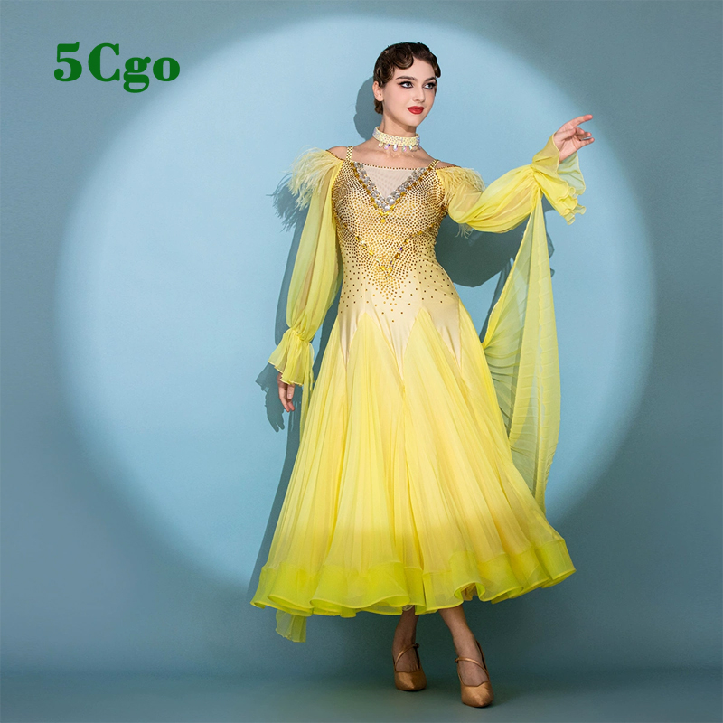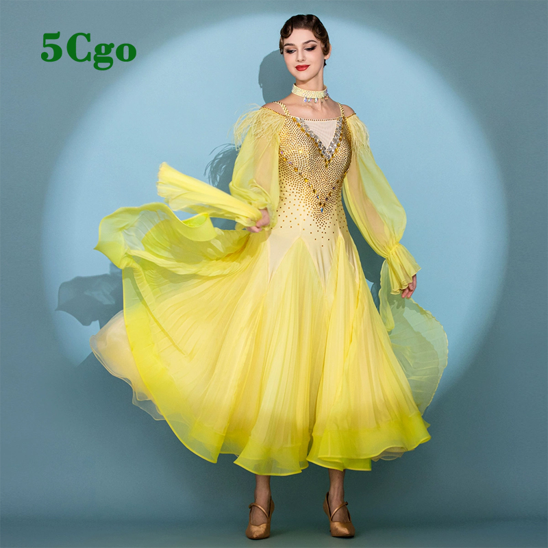 5Cgo【鴿樓】摩登舞裙舞蹈表演服裝黃色吊帶一字肩高定華爾茲大擺連衣裙貼鑽定制t940979858728