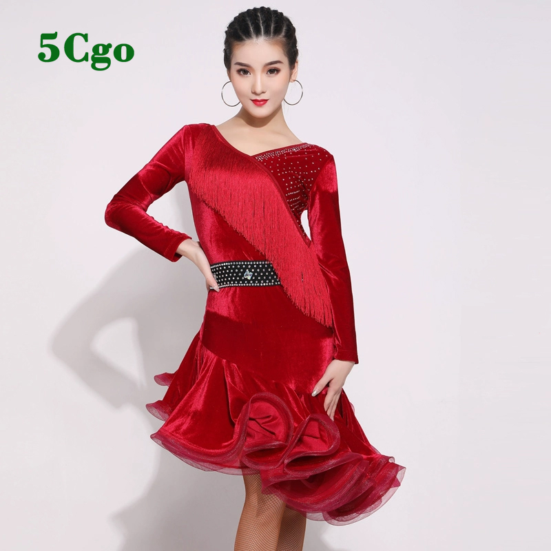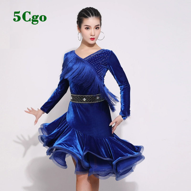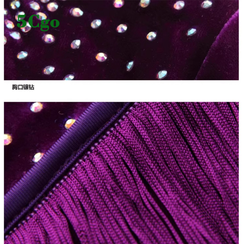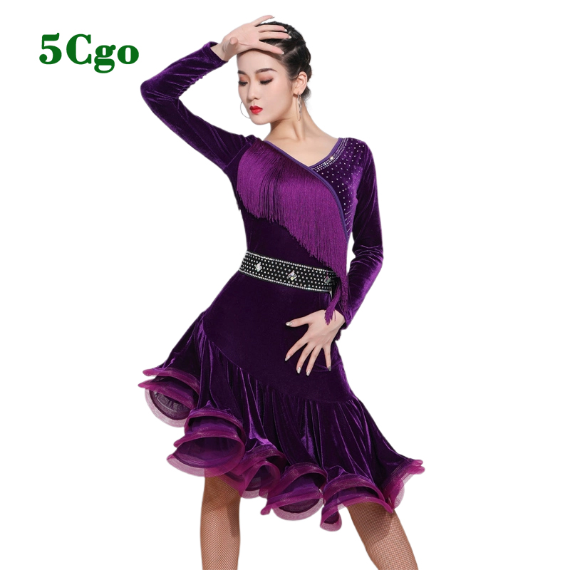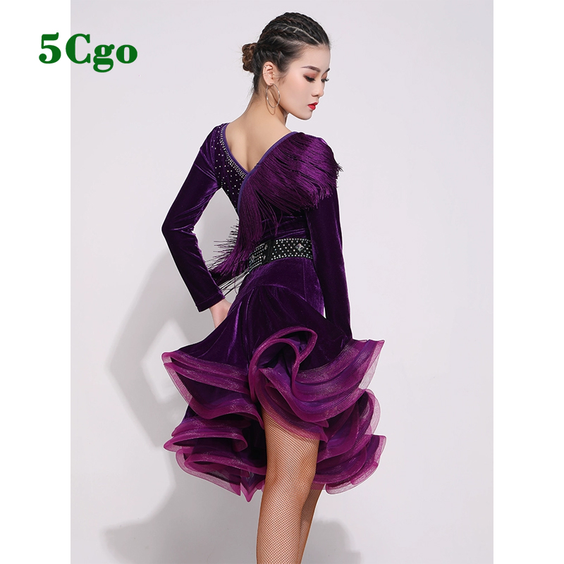 5Cgo【鴿樓】拉丁舞服女成人流蘇長袖絲絨洋裝新款練功服紫色紅色藍色秋冬季專業演出服t560642227165
