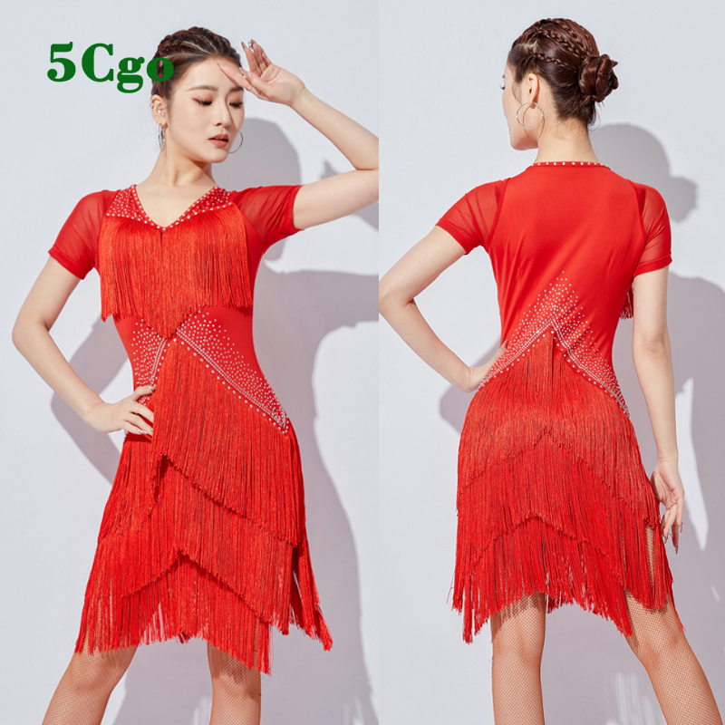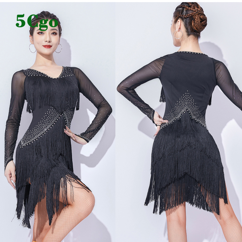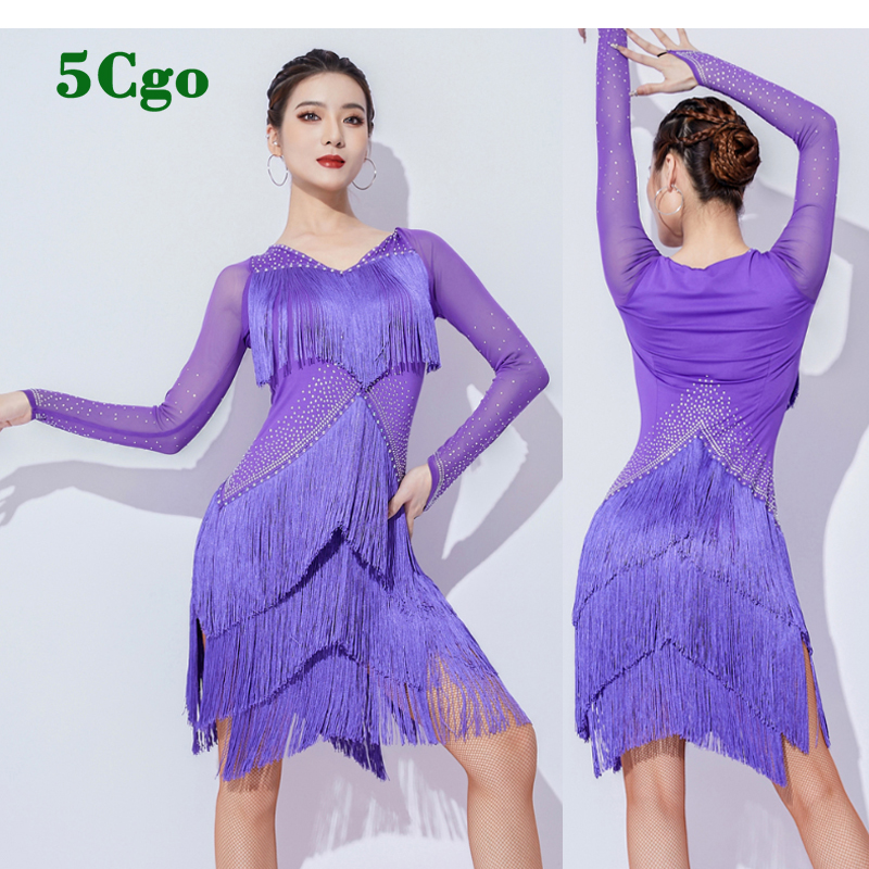 5Cgo【鴿樓】拉丁舞連衣裙紫色洋裝流蘇同鑽長袖短袖成人演出服比賽服t844844729143