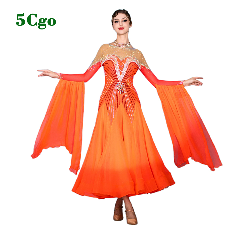 5Cgo【鴿樓】摩登舞裙桔色舞會標准舞重工仿奧鑽訂製國標舞洋裝國標舞表演舞衣送脖套定制t933997791685