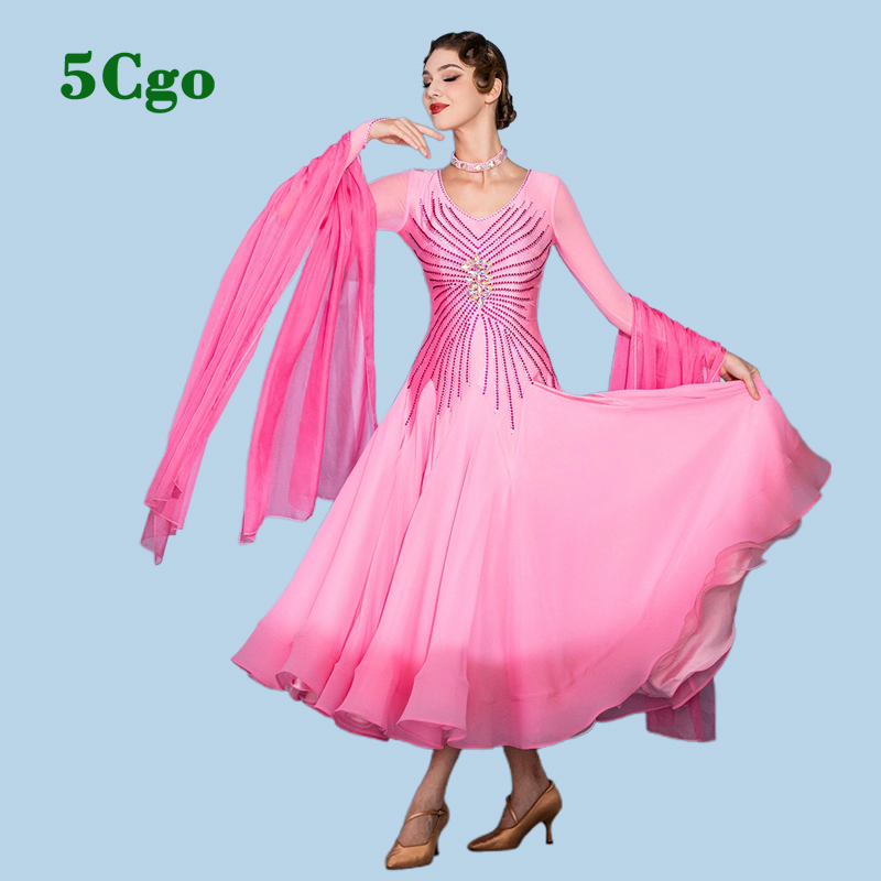 5Cgo【鴿樓】摩登舞裙舞蹈表演服裝粉紅色高定華爾茲大擺連衣裙貼鑽定制t938790423967