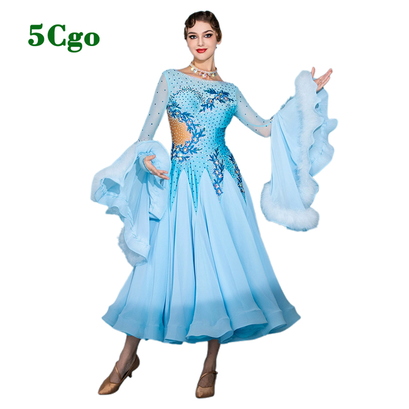 5Cgo【鴿樓】摩登舞裙孔雀藍國標舞大擺裙精美華爾茲燙鑽裙定制連衣裙t938003662556