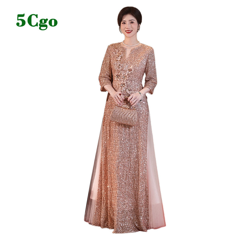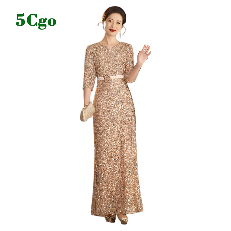5Cgo【鴿樓】金黃色晚禮服裙女亮片中袖修身高級感宴會長裙大氣演出主持人輕奢氣質連衣裙t710093773255