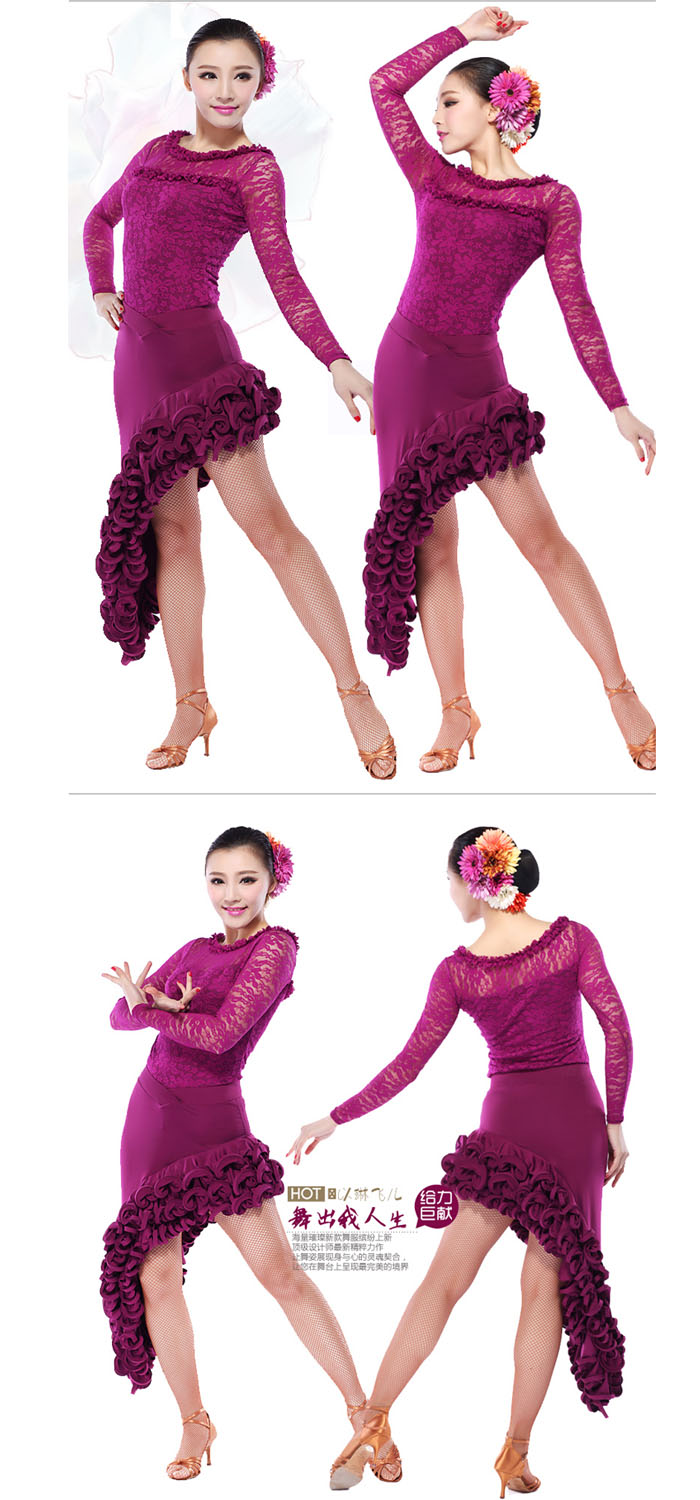 5Cgo 522566869034 成人長袖拉丁舞練習服裝斜肩設計蕾絲拼接螺旋裙 濃密擺拉丁舞裙 GSX87100