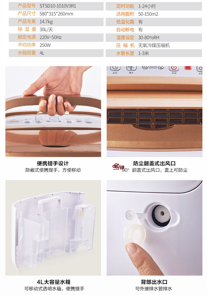 | 商品詳細 : 此為插 220V電的電器,購前請確認好您使用的場所是否有220V的電路 【型號】:STSD10-1010V3R1 【額定電壓】:220V 【功率】:250W 【外尺寸】:580*315*260mm 【除濕量】:30L/D 【淨重】:14.7KG 【濕度調節範圍】:30%~80% 【水箱容量】:4L 大陸製造,深圳公司安排出貨 | 注意事項 :