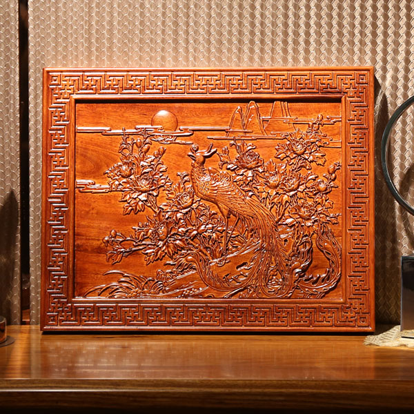 5Cgo 543779585221 實木香樟木雕花電表箱裝飾畫電源遮擋箱配電盒可推拉開關中式壁畫客廳會所臥室書房背景牆櫥窗花店咖啡廳畫廊50*40cm CHX00_富貴滿堂,左推