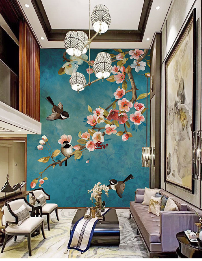 5Cgo 530898445309 代訂金復古中式手繪花鳥花枝壁紙藍綠色做舊牆紙喜上眉梢定制牆布大型壁畫玄關走廊住宅新居裝修設計 CHX80200