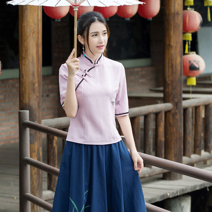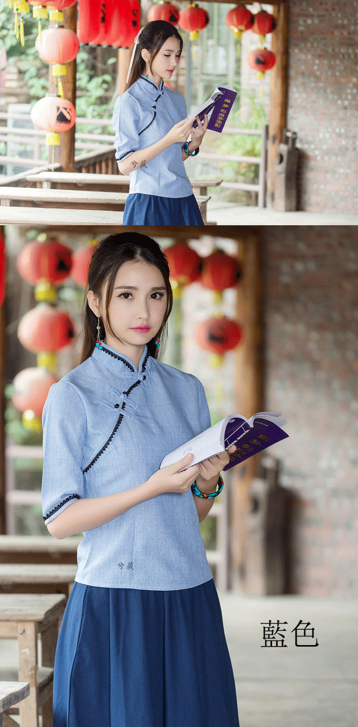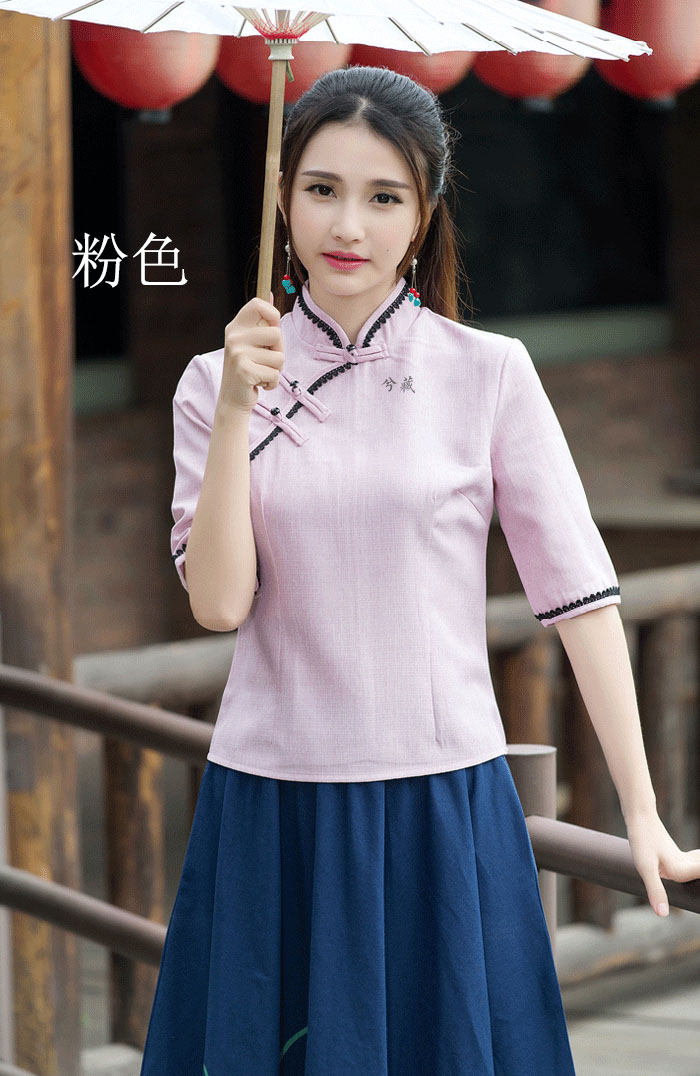 5Cgo 564165072399 夏季茶服女棉麻修身茶藝服裝中國風女裝茶道香道撫琴中式盤扣上衣短袖改良唐裝 HJT88100
