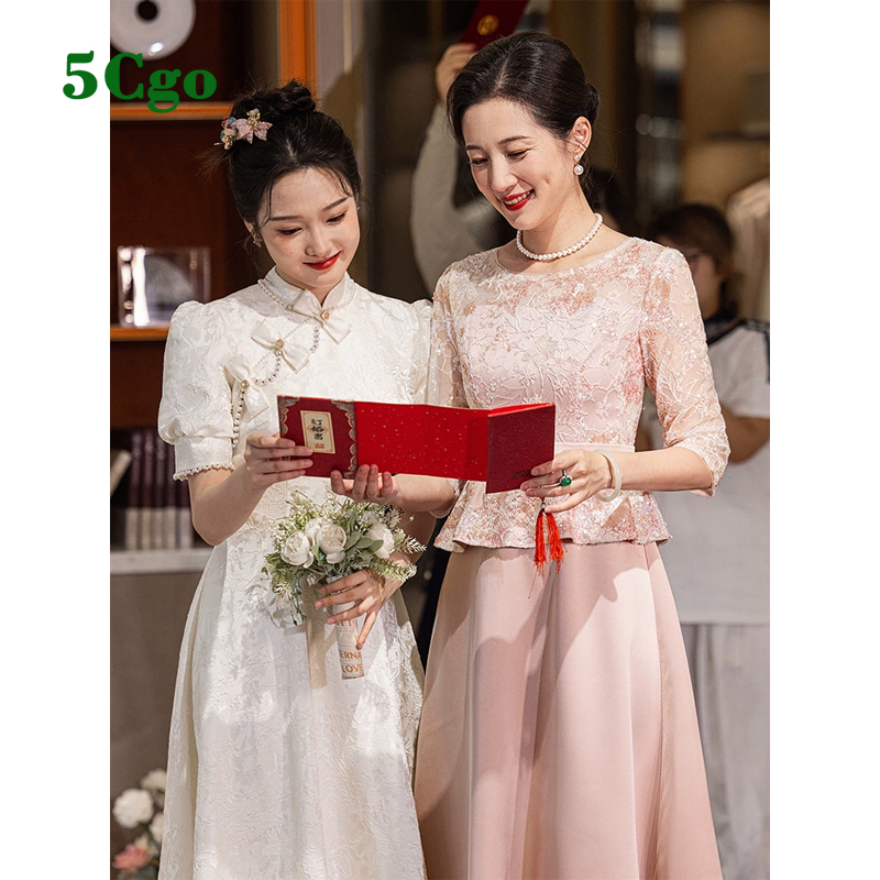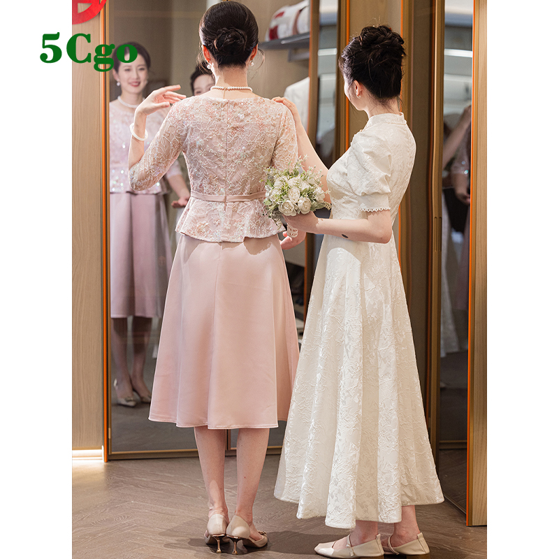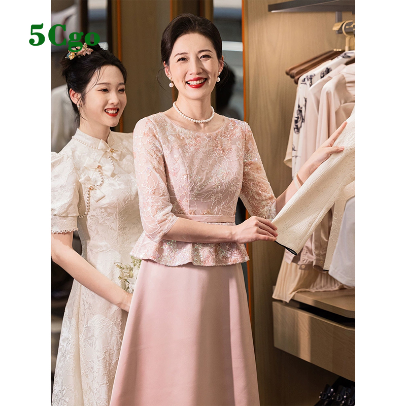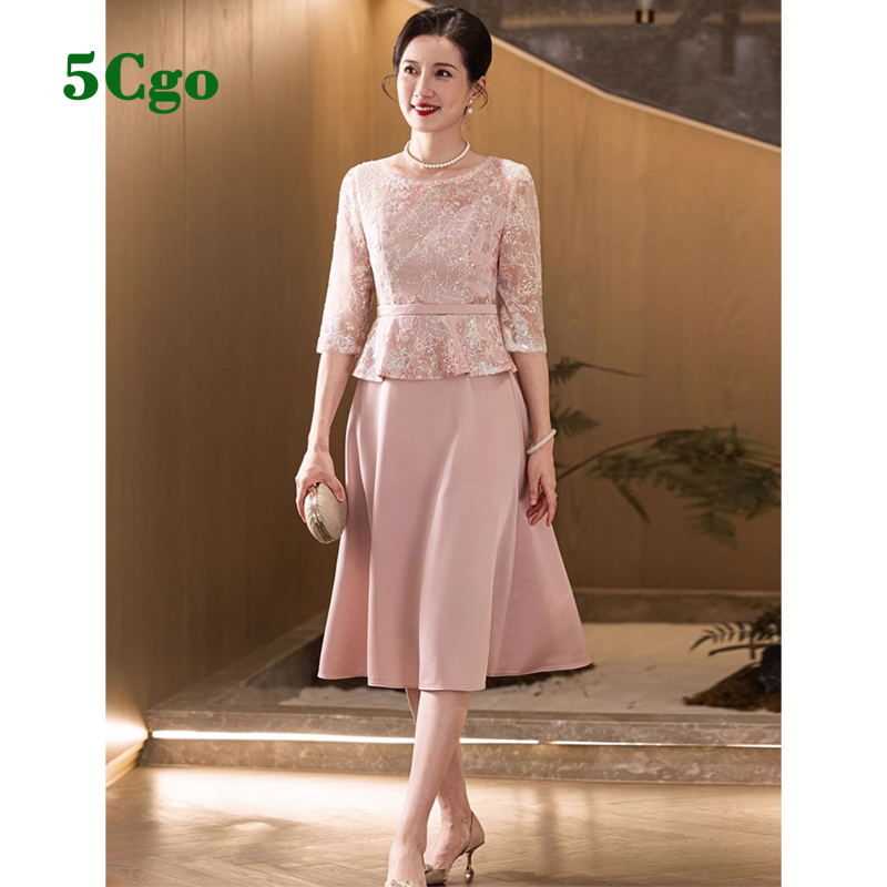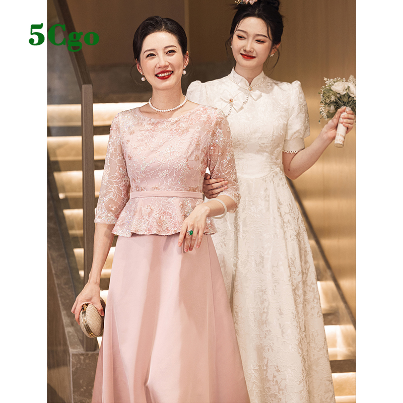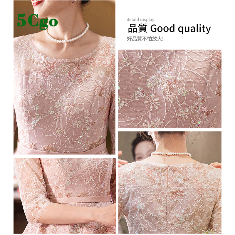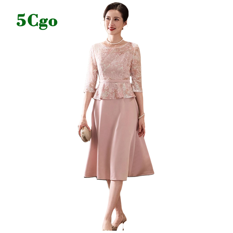 5Cgo【鴿樓】粉色媽媽婚宴晚禮服中袖洋裝圓領中袖中長裙t836638788687