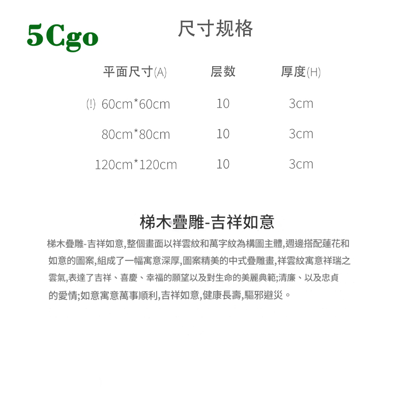 | | | | 商品名稱: | 5Cgo【樂趣購】梯木疊雕吉祥如意木質牆面裝飾壁飾圓形立體餐廳客廳茶室壁掛裝飾品t654355639870 | | 商品尺寸: | 60cm、80cm、120cm | | 材質: | 新西蘭進口E0級椴木板 | | 顏色: | 原木色、盛唐風格配色 | | 出貨配件: | 出貨僅木雕壁畫。(默認出貨盛唐風格配色80cm) 原木色60cm 10500元 原木色80cm 15600元 原木色120cm 28380元 盛唐風格配色60cm 14780元 盛唐風格配色80cm 20600元 盛唐風格配色120cm 35650元 | | 商品詳情: | 商品編號:t654355639870 ✨1.疊雕畫是什麼材料?環保嗎? 梯木疊雕選用紐西蘭進口EO級椴木板,經過雷射切割後由環保乳膠黏接,表面塗刷清漆,經三天靜置後完成,確保環保無害。