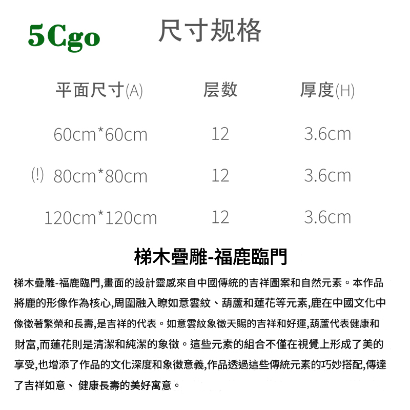 | | | | 商品名稱: | 5Cgo【樂趣購】梯木疊雕新中式福鹿餐廳玄關裝客廳飾畫新款簡約沙發背景牆裝掛畫壁畫t803102588902 | | 商品尺寸: | 60cm、80cm、120cm | | 材質: | 新西蘭進口E0級椴木板 | | 顏色: | 彩色 | | 出貨配件: | 出貨僅木雕壁畫。(默認出貨80cm) 60cm-13350元 80cm-19180元 120cm-32799元 | | 商品詳情: | 商品編號:t803102588902 ✨1.疊雕畫是什麼材料?環保嗎? 梯木疊雕選用紐西蘭進口EO級椴木板,經過雷射切割後由環保乳膠黏接,表面塗刷清漆,經三天靜置後完成,確保環保無害。