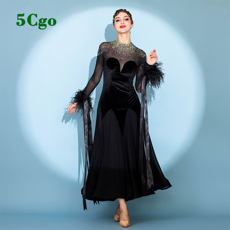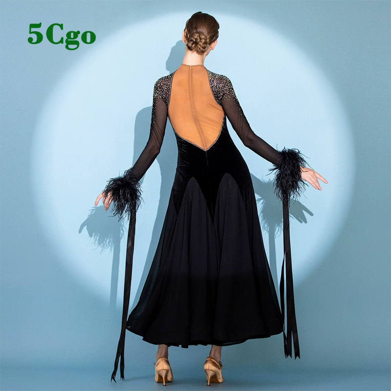 5Cgo【鴿樓】摩登舞裙標准舞練功服演出服黑色絲絨羽毛飄帶設計國標舞連衣裙華爾茲燙鑽長裙舞衣t922668339887