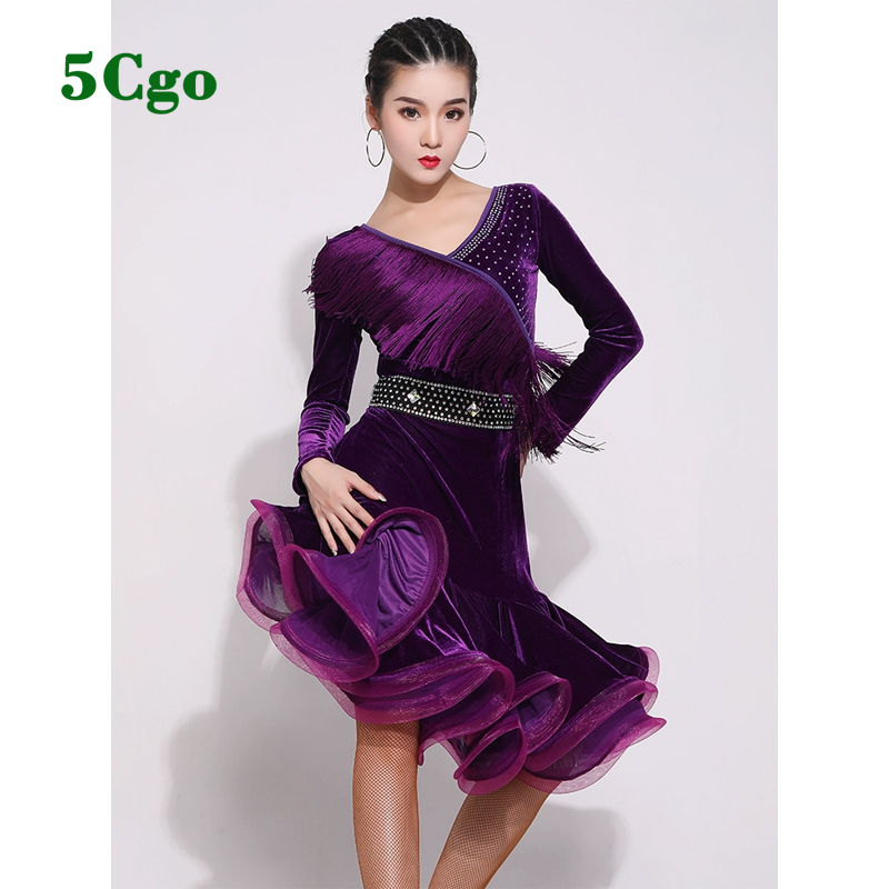 5Cgo【鴿樓】拉丁舞服女成人流蘇長袖絲絨洋裝新款練功服紫色紅色藍色秋冬季專業演出服t560642227165