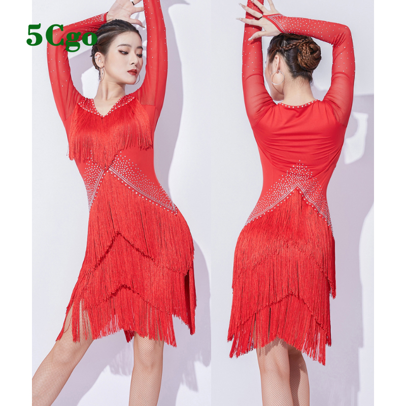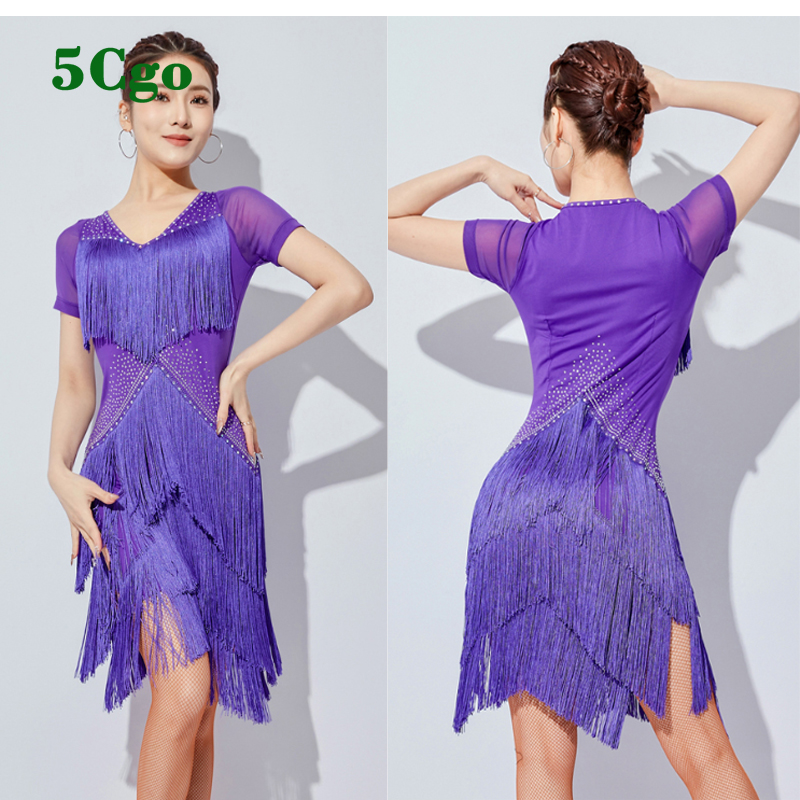 5Cgo【鴿樓】拉丁舞連衣裙紫色洋裝流蘇同鑽長袖短袖成人演出服比賽服t844844729143