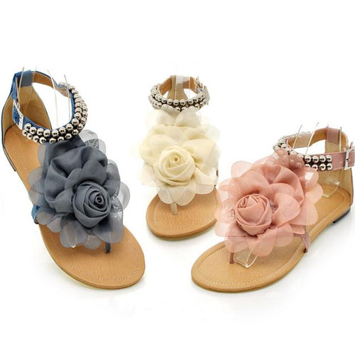 商品名稱: 甜美雪纺花朵平底夹趾凉鞋夏季波西米亚串珠舒适平跟大码女鞋