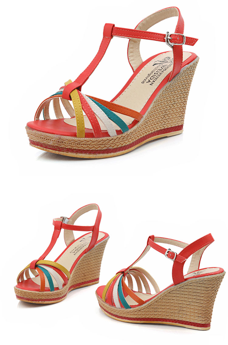 5Cgo 24064788255 夏季女鞋坡跟涼鞋甜美拼色高跟松糕厚底魚嘴涼鞋 MIK93000