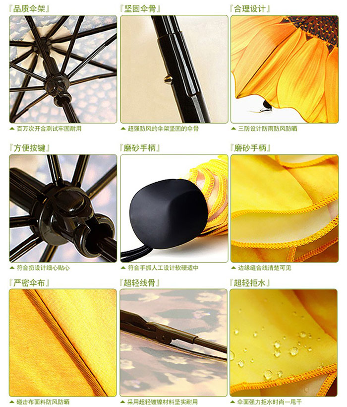 | 商品編號: | 19162721835 | | 商品名稱: | 向日葵雨傘創意三折天空晴雨防曬傘折疊遮陽傘防紫外線傘 | | 商品尺寸: | 收攏24cm 傘下98cm 550*8K | | 商品顔色 | 向日葵傘 雛菊傘 藍天白雲傘 香橙傘 地圖傘 | | 注意事項: | ★均為實物拍攝,由於光線顯示器等原因圖片顏色可能與實物有些偏差、請以實物為准 。 ★請務必仔細查看包的尺寸(測量手法不同,誤差1-3cm正常哦) ★海外出貨物品,一律不退不換。 ★傘一定要當著快遞面先驗貨後簽收, 無論任何理由沒有驗貨就簽收了,出現問題一律不退不換。 |
